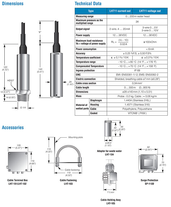 The LHT11 consists of a stainless steel measuring cell, transmitter, stainless steel probe and a special breathing cable. Stainless flush diaphragm is protected by use of a stainless protection cap. Easy installation and wiring is ensured by the use of the complete set of accessories. For outdoor measurements the application of over voltage protection is suggested.